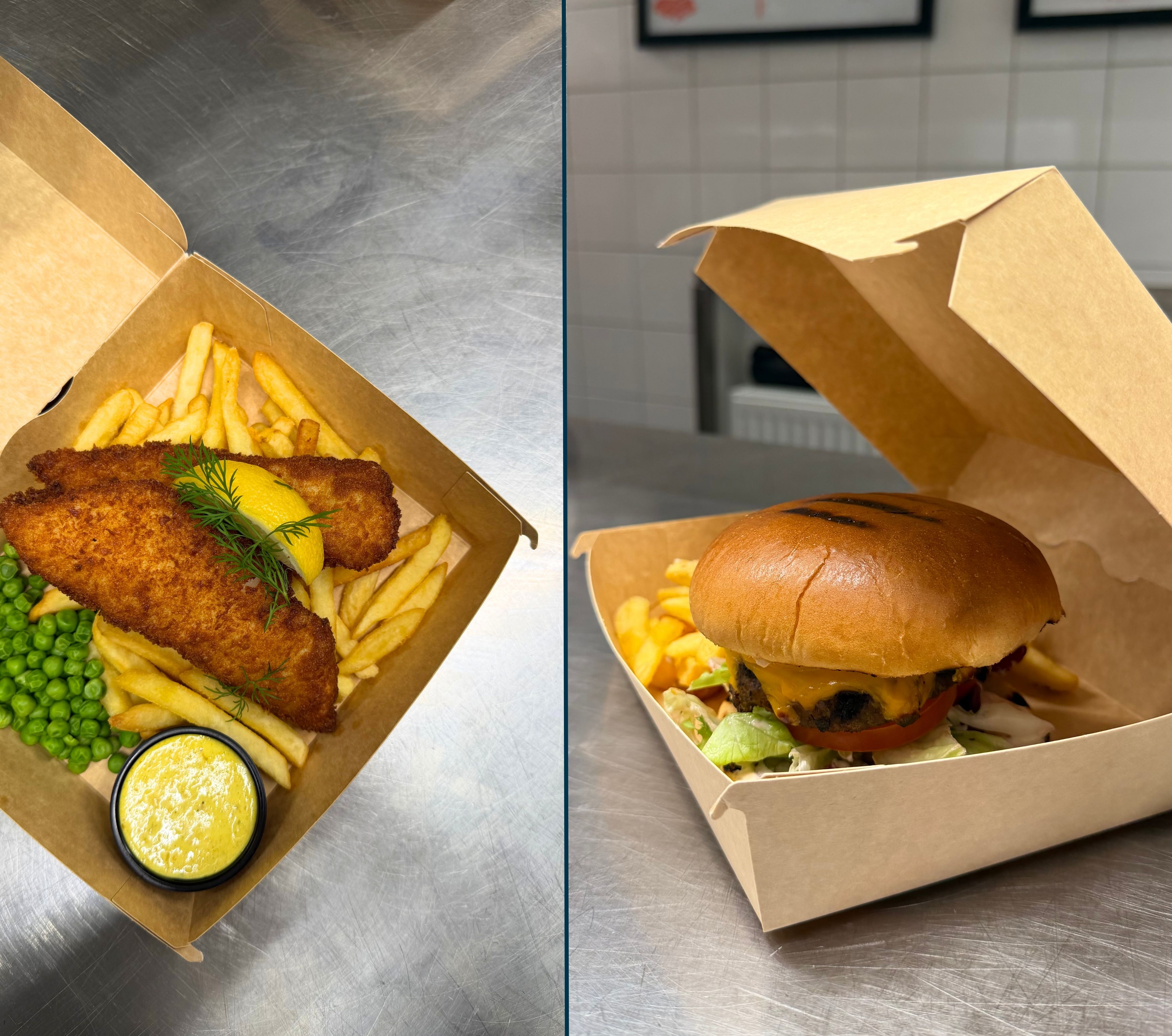Smidig brun hämtbox som är perfekt till flera olika typer av måltider. Matförpackningen är livsmedelsgodkänd och fungerar lika bra till hamburgare & pommes frites som till fish & chips och annan takeaway.